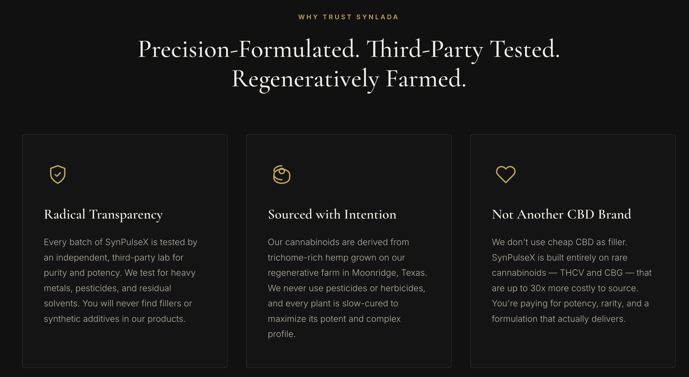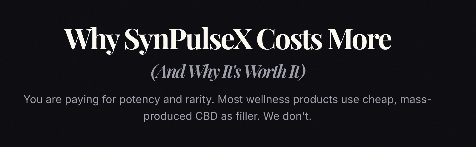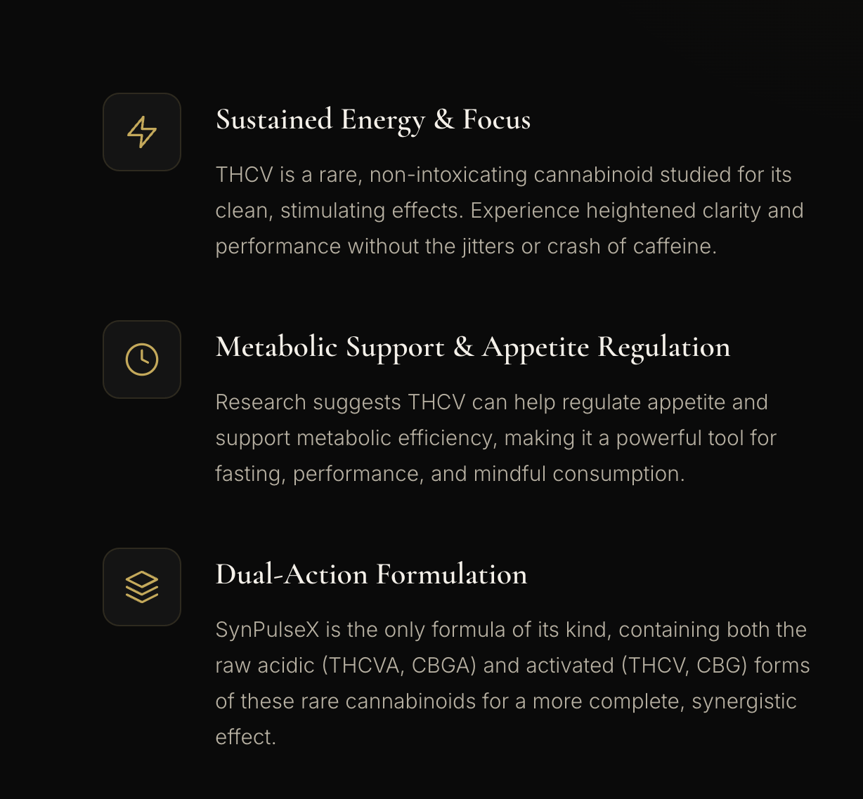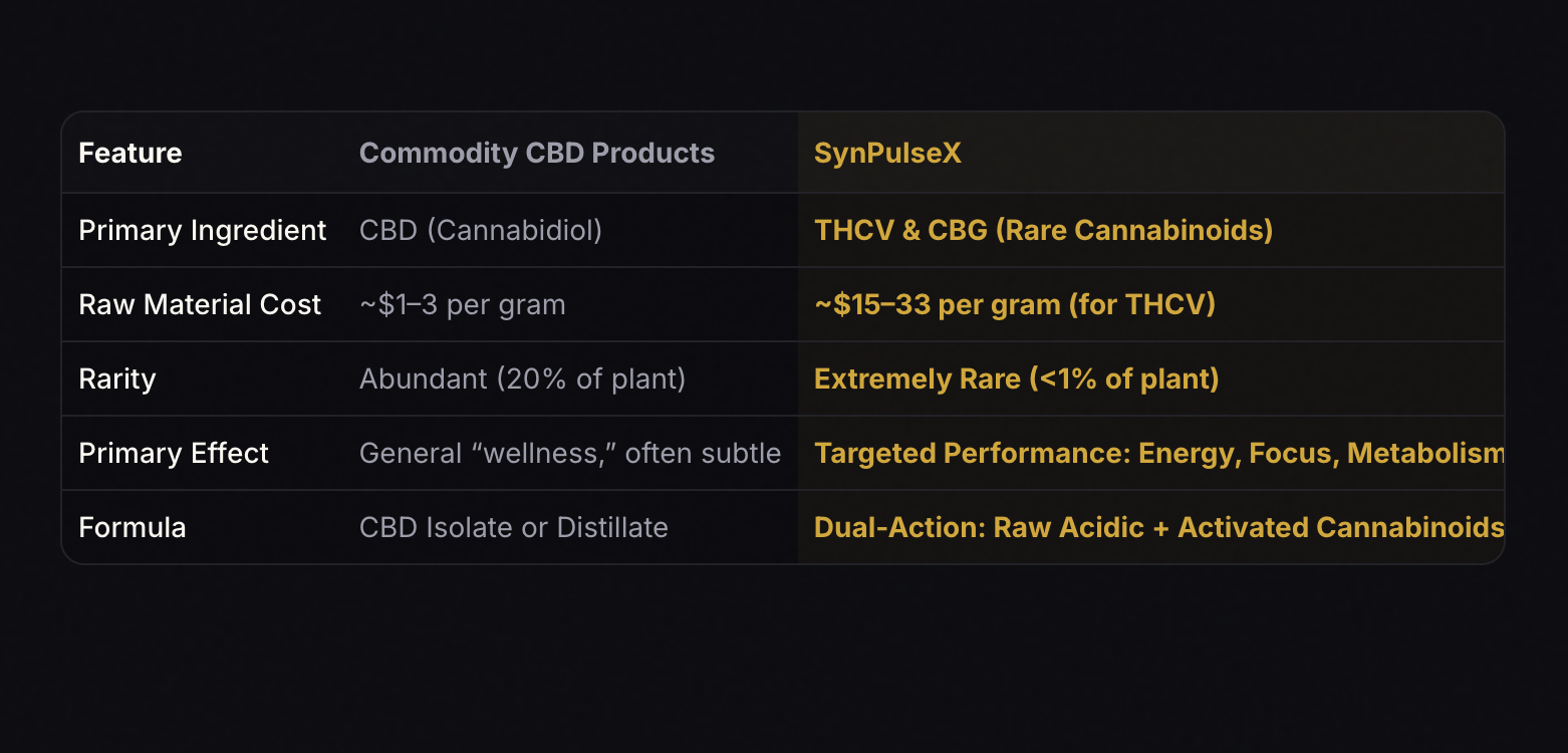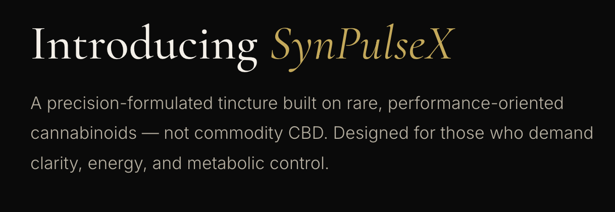 Experience the power of rare cannabinoids. SynPulseX is a precision-formulated tincture made with THCV and CBG to enhance performance, curb cravings, and sustain mental clarity—without the noise of the oversaturated CBD market.